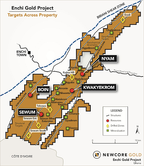Greg Smith, Vice President of Exploration of Newcore stated, "We have a district scale exploration opportunity at Enchi, and with this latest resource estimate we continue to highlight the multi-million-ounce potential that exists at the Project. With the drill rigs turning, I am excited to continue to prove out the longer-term resource growth potential that exists across Enchi, with our most recent drilling completed at Boin successfully extending gold mineralization to depth and highlighting the potential for significant growth longer-term by defining the deeper extents of the high-grade mineralization at Enchi."