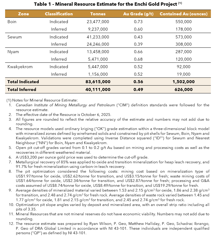The Resource expanded the Indicated Mineral Resource at Enchi to 83.6 million tonnes at an average grade of 0.56 grams per tonne gold ("g/t Au") containing 1,502,000 ounces gold, along with an Inferred Mineral Resource of 40.1 million tonnes at an average grade of 0.49 g/t Au containing 626,000 ounces gold. The Resource is reported using a constraining resource pit at a gold price of US$3,200 per ounce and has an effective date of October 6, 2025 (incorporating results from drilling completed up to October 6, 2025). Since October 2025, an additional 10,619 metres of drilling has been completed on the Project which is not included in the Resource. The Indicated Mineral Resource will form the basis for the Pre-Feasibility Study ("PFS") which is underway and targeted for completion by the end of June 2026 (see news release dated February 5, 2026).