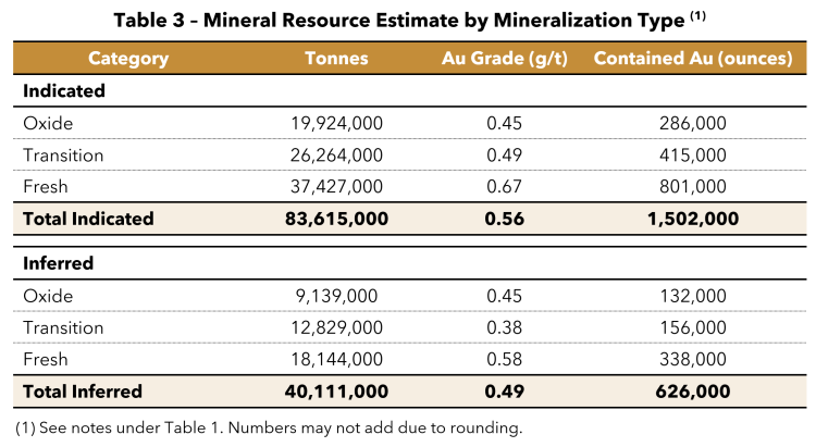 • Indicated Mineral Resource of 1,502,000 ounces of gold at an average grade of 0.56 g/t Au within 83.6 million tonnes, more than double the last Indicated Resource for the Project published in 2023 (see news release dated March 7, 2023).