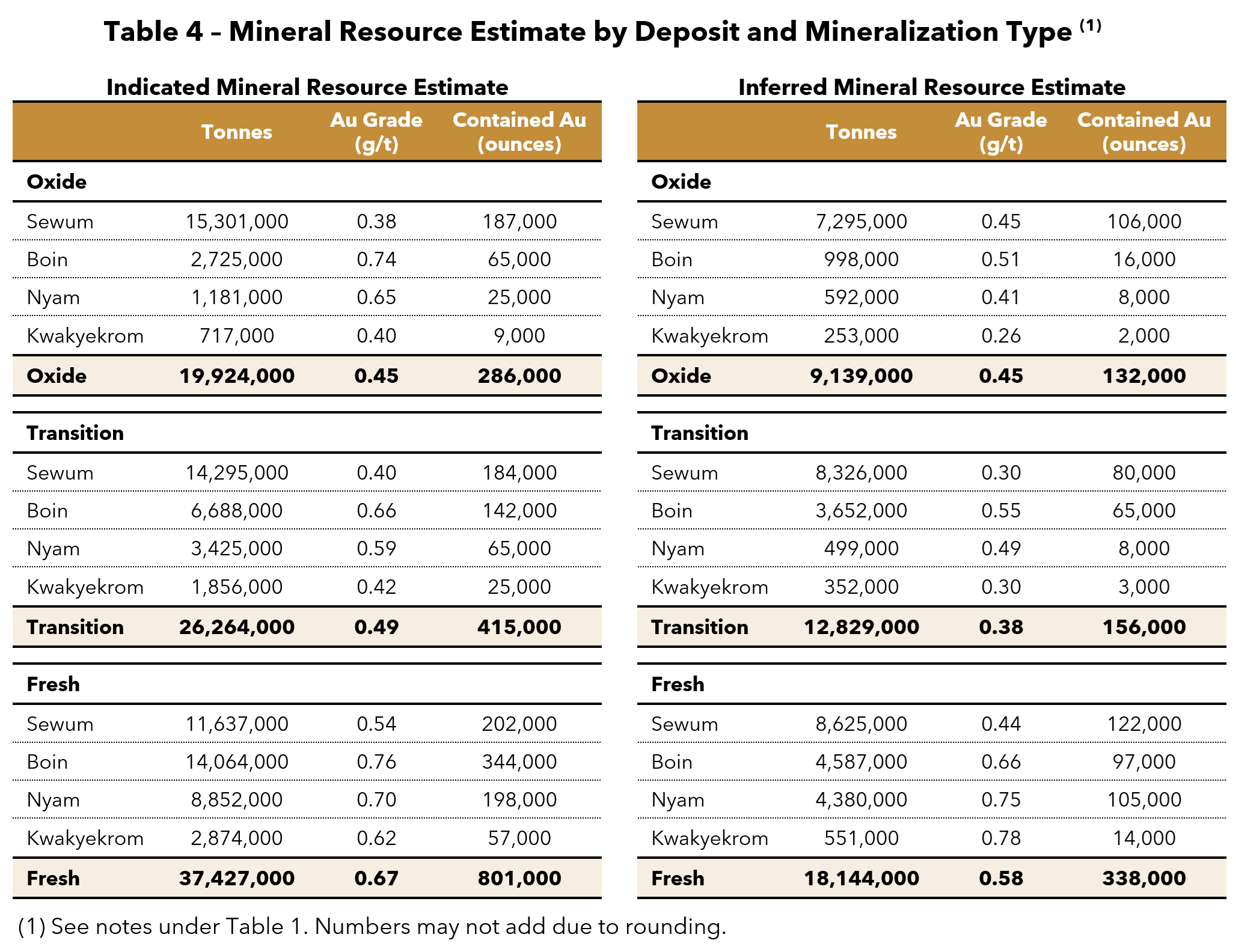 • Resource includes four pit-constrained deposits (Sewum, Boin, Nyam, Kwakyekrom), with all deposits open along strike and at depth with potential resource growth in shallow oxide and transition mineralization, as well as within the deeper fresh mineralization.